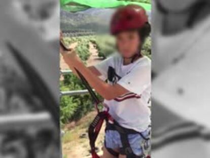 El pequeño, asustado y al borde del llanto, pide a su instructor abandonar la actividad. "Me encanta cuando hacen pucheros, tío", afirma el instructor tras el salto del menor