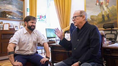 El cantautor cubano recorre la sede del Gobierno junto a la portavoz Camila Vallejo. “Es un amigo”, ha dicho el artista sobre el mandatario de izquierdas