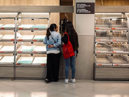 Sin caos, pero con cierta tensión, vecinos, turistas y oficinistas compran comida y productos básicos en una gran tienda de Barcelona donde todas las neveras están cerradas