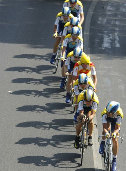 Astana marcó en meta un tiempo de 46.29 minutos, 18 segundos mejor que el Garmin y 40 por encima del Saxo Bannk, único equipo con favoritos (Andy Frank Schleck) que se salvó de las garras del cuadro kazako. El Caisse D''Epargne actuó a buen nivel, séptimo a 1.29 minutos, el Cervélo de Sastre se dejó 1.37 y el mayor pellizco en las aspiraciones se lo llevaron el Rabobank del ruso Menchov, a 2.20 y el Silence de Evans, a 2.35. La exhibición del Astana a lo largo de los sinuosos 39 kilómetros de recorrido, le permitió colocar a cinco hombres en el top ten y alejar a un buen puñado de rivales en la general. Cancellara salvó por los pelos el jersey de líder, pero sabe que su destino es la espalda de Armstrong, segundo en la general con el mismo tiempo y Alberto Contador accedió de nuevo al podio como tercero, a 19 segundos de su compañero, rival, ¿y jefe?. El resultado abona un debate que enciende el Tour por los cuatro costados.