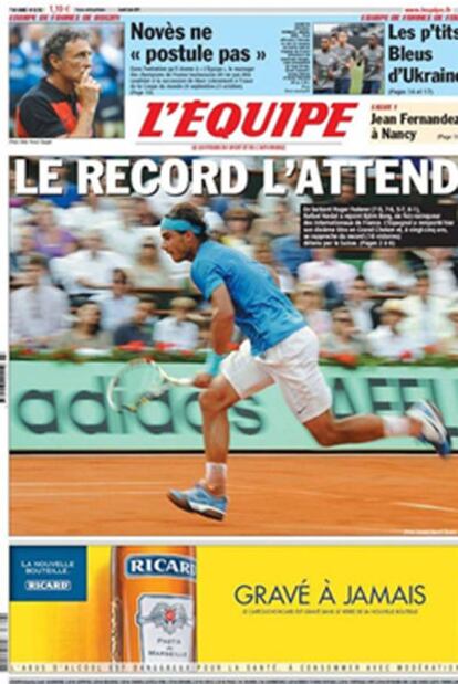 La prensa internacional, con Francia a la cabeza, hace una extensa cobertura de la sexta victoria de Rafael Nadal en Roland. El país galo se rinde ante el tenista español, dominador indiscutible de su torneo en los últimos años. El diario deportivo L'Equipe abre con una foto del número uno a toda a página y su titular va más allá de la gran victoria de ayer: "El récord le espera". El periódico señala que, una vez igualado el número de triunfos en Roland Garros del sueco Björn Borg, y con solo 25 años, Nadal aspira a igualar el mayor número de victorias en los grandes torneos del tenis, 16, que ostenta su rival en la final, el suizo Roger Federer. En su edición digital, L'Equipe destaca además la declaraciones del español, al que califica como "cyborg", en las que reconoce haber "tenido dudas" y haber sufrido como nunca este año.