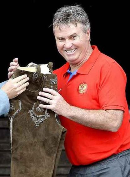 Hiddink se pasó media hora haciendo reverencias ante el alcalde de Leogang, y hasta tuvo que empinar el codo para tragarse la dosis de aguardiente que prescribe la liturgia de las ceremonias alpinas. Dos muchachas vestidas de campesinas le ofrendaron un pan casero negro y un cuenco con sal, símbolo de buena suerte. La banda del pueblo tocó Castillo de Leuchtenburg y empezó a encadenar marchas militares para infundir a la recepción la clase de atmósfera que saben darle los austríacos a las fiestas folklóricas. Los jugadores rusos marcaron el ritmo con las cabezas. Un rumor de risas sacudió la formación cuando el técnico posó con unas bermudas alpinas de cuero, donación a cargo de la Oficina de Turismo. Por un momento, la figura de Boris Yeltsin revivió en los prados del valle de Leogang gracias al sentido teatral de Hiddink.