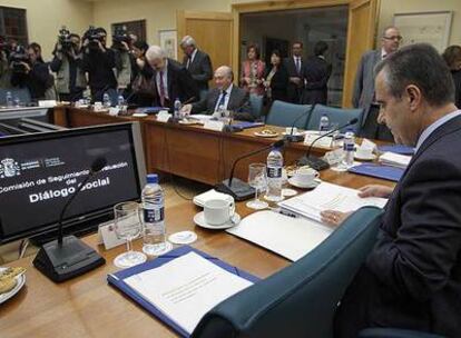 La comparecencia llegó tras una reunión de la comisión de seguimiento del diálogo social, aplazada en dos ocasiones la semana pasada por la imposibilidad de llegar a un acuerdo entre las partes (Gobierno, UGT, CC OO, CEOE y Cepyme). Entre el auditorio, junto a los periodistas, sindicatos y patronal esperando su turno para hacer declaraciones. Nada de fotos de familia.