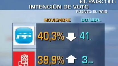 En este contexto, se confirma también la tendencia que apuntó el sondeo de mediados de octubre, en el que por primera vez se vio un desgaste de las posibilidades electorales del PP, debido a las investigaciones de corrupción. Tres puntos y medio llegaron a separar a ambos partidos hace sólo un mes. El PSOE ha subido casi dos puntos (aunque con un 39,9% de estimación de voto sigue lejos del resultado electoral de 2008). El PP ha perdido un punto entero en 15 días dramáticos. La distancia es ahora de cuatro décimas. Empate técnico, según Metroscopia.