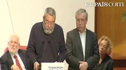 El secretario general de UGT, Cándido Méndez, se ha mostrado sorprendido en su discurso de que las querellas contra el juez provengan "de organizaciones que deberían ser ilegales". La declaración conjunta añade que los impedimentos judiciales que el Supremo impone al magistrado habrían hecho "imposible el proceso de Nüremberg contra los nazis". Las reacciones políticas al acto no se han hecho esperar. La secretaria general del PP, María Dolores de Cospedal, lo ha calificado de"disparate" y "atentado contra la democracia" que trata de "presionar" al juez Luciano Varela, el magistrado del alto tribunal que ha firmado los autos más duros contra Garzón por investigar los crímenes del franquismo y que, en opinión de la número dos del PP, "ejerce su magistratura de acuerdo con la ley".
