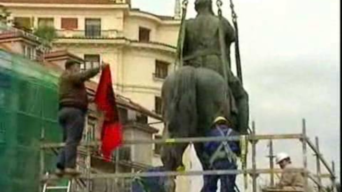Los trabajadores desconocían el anclaje de la estatua de bronce, de unas cinco toneladas, al pedestal de piedra, de modo que han tenido que atacar el hormigón con martillos hidráulicos.