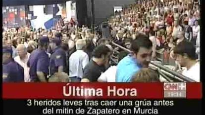 Varias personas resultaron heridas de carácter leve este viernes al caer el cabezal de una torre de toma de imágenes de televisión instalada en el pabellón Príncipe de Asturias, de Murcia, poco antes de que comenzara un mitin del presidente del Gobierno, José Luis Rodríguez Zapatero.