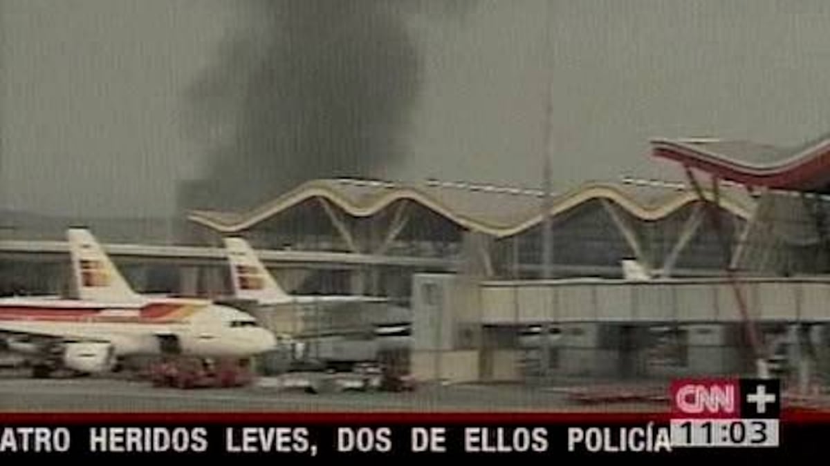 Otras cinco personas, dos de ellas agentes de la Policía Nacional, han resultado heridas leves a consecuencia de la deflagración.Otras 21 personas han sido atendidas. La explosión se ha producido a las 9.00 horas, según ha informado Interior a este periódico. Una hora antes, un comunicante anónimo ha hecho tres llamadas de aviso, la última en nombre de ETA. El estallido, controlado por la policía, se ha producido con la zona ya acordonada. Los daños materiales son cuantiosos, ya que se ha hundido el techo de cuatro plantas. El tráfico aéreo de la T-4 estuvo interrumpido hasta las 13.30 horas y comienza a recuperar la normalidad. Miles de viajeron han resultado afectados.