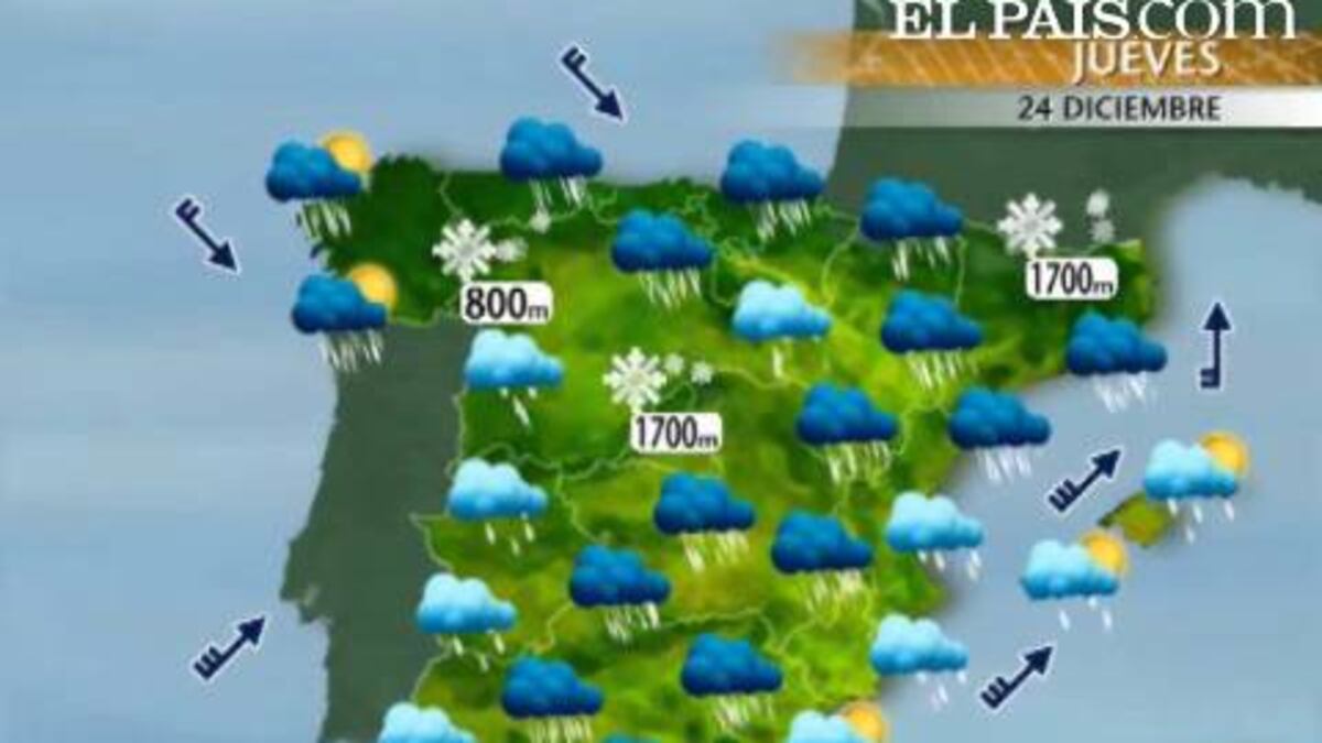 La cota de nieve se situará durante el día a 1.200 metros y bajará por la tarde a 1.000 metros en la mitad norte peninsular. El viento será del Suroeste moderado localmente fuerte, sobre todo en el litoral andaluz, Estrecho, Baleares y oeste de Canarias. Las temperaturas subirán de forma generalizada el jueves.
