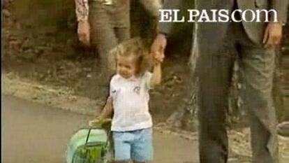 Los tres han llegado caminando a la guardería, como una familia normal. Leonor iba en brazos de su padre pero, al llegar, ha continuado caminando sola y tirando, con alguna que otra dificultad, de su pequeña mochila. Al llegar, su madre se ha ocupado del bulto y la niña ha cogido las manos de sus padres para subir las escaleras de la Escuela Infantil Guardia Real de Madrid.