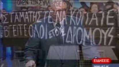 La cadena, que en esos momentos ofrecía una información sobre la comparecencia en el Parlamento del primer ministro, el conservador Costas Karamanlis, ha fundido la imagen del mandatario con la de los manifestantes congregados en el interior del estudio del telediario. A continuación se han interrumpido las imágenes de la crónica y poco despúes el sonido de la misma. En las pantallas han permanecido los manifestantes, en silencio, portando pancartas donde se podía leer: "Dejad de mirar y salid todos a las calles", o "Libertad para todos".