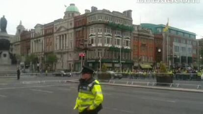 Pero también el silencio acompañará a la soberana: el silencio de las calles cortadas a su paso para evitar cualquier incidente. Muchas vías de la capital irlandesa (hasta 70 se verán afectadas) llevan horas cortadas al tráfico rodado. Las autoridades han dispuesto varias filas de vallas entre el asfalto por donde circulará el coche de la reina y la acera donde aguardan ya los que quieren asistir a su visita. La policía registra, a su conveniencia, a los ciudadanos que quieren arrimarse a la vallas para ver de cerca a Isbael II.