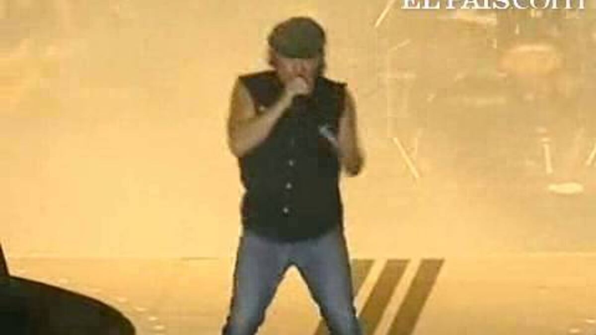 A las 22.05 se apagaron las luces. Muchos tenían el recuerdo reciente de su concierto en abril en el Palacio de Deportes, que ganó en sonido pero no en espectáculo. Miles de cuernos de color rojo infierno -que por 10 euros se vendían a la entrada- lucían en el estadio, mientras en las pantallas una locomotora se estrellaba contra el escenario. Explotan los fuegos artificiales y allí estaban. Los dioses: Angus, con su eterno traje de colegial verde, y su hermano Malcolm Young, de 55 y 56 años, con la vitalidad de unos adolescentes. "Puedo oler el rock and roll", dijo Brian Johnson, de 61 tacos, músculos de estibador y voz cascadísima. Caía clásico tras clásico (Dirty deeds done dirt cheap, Shot Down in flames o la potentísima Thundersck), mezclados con canciones de su nuevo disco Black Ice (afortunadamente no sonaron más de cuatro) y el público compuesto, por un 80% de hombres, tan feliz.