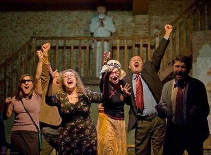 La escena de los cuatro parroquianos impíos en torno al cadáver de su vecino tiene algo del velorio de La rosa de papel y otro tanto de Juanito Ventolera expoliando al finado esposo de La Boticaria en Las galas del difunto. Ese final de acto, que avanza a lo Valle-Inclán para desembocar en Atraco a las tres, debiera ser, para mi gusto, el final de la comedia, su remate grotesco. Sin embargo, la autora, a petición de Amelia Ochandiano, directora de este montaje, le ha puesto un epílogo, ritmado con el Bolero de Ravel, donde cada personaje nos explica su destino. No hace falta: está en otro estilo, y cierra un expediente que abierto sabía mejor.