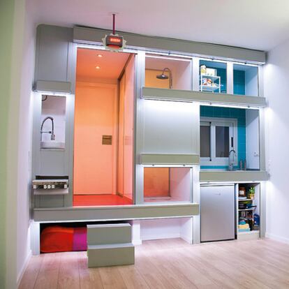 Los espacios funcionales se relacionan con la zona de hogar mediante una serie de persianas, creando una fachada interior que provoca una extraña sensación de límites difusos entre dentro y fuera. El núcleo central se eleva del suelo 60 centímetros y aloja las instalaciones de fontanería, electricidad y saneamiento, integrando en este espacio la bañera y la ducha (que quedan enrasadas a nivel del suelo). Ambas situaciones permiten configurar diferentes disposiciones funcionales: abriendo o cerrando las persianas se pueden sacar o esconder algunos de los elementos de la casa, como la cocina, la cama, la escalera o la tabla de planchar.