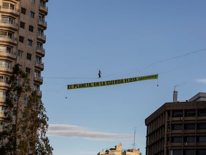 Una activista de Greenpeace mantiene el equilibrio sobre un cable a 30 metros de altura en la plaza de España de la capital