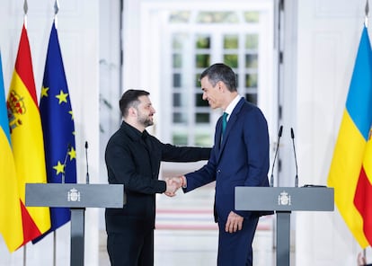El presidente del Gobierno, Pedro Sánchez, el presidente ucraniano, Volodímir Zelenski, el ministro de Cultura, Jordi Hereu, y la embajadora de Ucrania en España, Yulia Sokolovska, durante la firma de un acuerdo este martes en el Palacio de la Moncloa en Madrid.Álvaro GarcíaEl presidente del Gobierno, Pedro Sánchez, junto al presidente ucraniano, Volodímir Zelenski, durante la rueda de prensa conjunta ofrecida este martes en el Palacio de la Moncloa en Madrid.Álvaro GarcíaEl presidente del Gobierno, Pedro Sánchez, y el presidente ucraniano, Volodímir Zelenski, durante su encuentro este martes en el Palacio de la Moncloa en Madrid.Alvaro GarciaEl presidente del Gobierno, Pedro Sánchez, y el presidente ucraniano, Volodímir Zelenski, posan frente al 'Guernica' de Pablo Picasso, este martes en el Reina Sofía. APEl presidente del Gobierno, Pedro Sánchez, y el presidente ucraniano, Volodímir Zelenski, observan el 'Guernica' de Pablo Picasso, este martes en el Reina Sofía. Fernando Calvo (EFE)El rey Felipe VI recibe al presidente de Ucrania, Volodímir Zelenski, este lunes en el Palacio de La Zarzuela. Alejandro Martínez Vélez (Europa Press)La presidenta del Congreso, Francina Armengol, y el presidente del Senado, Pedro Rollán, reciben al presidente de Ucrania, Volodímir Zelenski, en el Salón de los Pasos Perdidos en el Congreso de los Diputados en Madrid, este martes.
