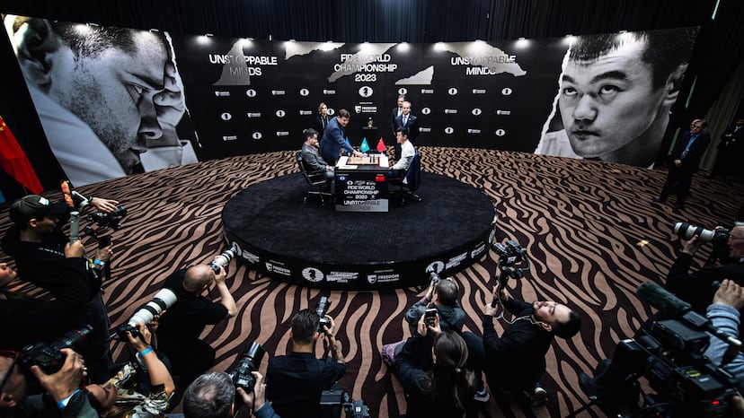 Las aguas del río Ishim se veían heladas desde el lujoso hotel Saint Regis en Astaná, sede del duelo. Pero las cabezas de los dos gladiadores mentales ya quemaban desde que llegaron al escenario. Niepómniashi, diez minutos antes de la hora, traje gris y camisa rosa oscuro; Ding, tres minutos después, traje azul marino y camisa blanca; ambos sin corbata. Aunque ponía cara de póquer, un gesto contra la etiqueta delató la tensión nerviosa del chino: se quitó la chaqueta antes de que el ministro de Deportes, Asjat Orálov, y el presidente de la Federación Internacional de Ajedrez (FIDE), el ruso Arkady Dvorkóvich, hicieran el saque de honor. Niepómniashi, con la experiencia del duelo que perdió ante el todavía campeón, el noruego Magnus Carlsen (Dubái, 2021), parecía más tranquilo.