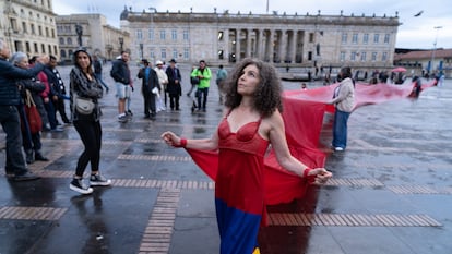 Mónica Savdié (Bogotá, 1963) ha dedicado su trabajo artístico a la realidad colombiana. Examen de Visión 20/20 fue una obra gráfica sobre el conflicto armado. Con Escaques dedicó una escultura a las problemáticas sociales, políticas y ambientales y con La Partida relató un secuestro en un libro. Ríos de sangre, la performance que presentó este miércoles, empezó con siete metros, pero la violencia, que se desborda en Colombia, le obligó a sumar más tela. “Cuando alcancé los 73 metros del “río”, me dije: cruzaré la Plaza de Bolívar antes de que se acabe el mandato actual”, cuenta. Y recibió donaciones y sus amigos le ayudaron con dinero para que pudiera cumplirlo. Cruzó la plaza arrastrando 130 metros de tela roja.