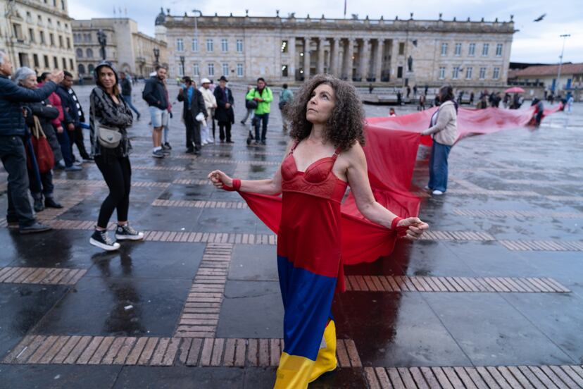Este miércoles, en el centro del poder político en Bogotá, en la Plaza de Bolívar, un “río de sangre” –una enorme tela roja– se extendió por 130 metros, de un extremo al otro. La artista, que también es periodista y diseñadora industrial, desenvolvió la tela al compás de sus pasos hasta cruzar toda la plaza. Es un homenaje a Mario y Elsa, y a otras tantas –miles– de víctimas que ha dejado el conflicto armado y la injusticia de Colombia. Savdié también lo hace por los jóvenes que encontró en el estallido social del año pasado .“Fue fabuloso ver a tantos jóvenes apropiándose de las calles con cantos y banderas. Habían despertado por un mejor futuro, por un mejor país. Al ver tantas banderas con los colores invertidos, clara señal de la sangre que se ha desbordado en esta nación, me sintonicé con ellos, confeccioné el traje con la bandera invertida y comencé a acompañar a esa indignada juventud con un río de sangre”, cuenta por teléfono unas horas antes de su puesta en escena.