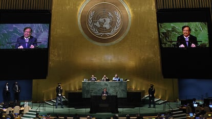 El mensaje ecologista y a contracorriente de Gustavo Petro se ha oído con más fuerza que nunca este martes en la Asamblea General de la ONU, en Nueva York. El presidente ha utilizado en todo momento un tono desafiante y antiestablishment ante los líderes de todo el mundo. Sin rodeos, ha calificado de fracaso la guerra contra las drogas y la lucha contra el cambio climático. Su discurso ha estado regado de críticas veladas a EE UU por las invasiones a otros países, la dependencia mundial del petróleo y los estragos del capitalismo especulador. “El desastre climático matará centenares de millones de personas y oigan bien, no lo produce el planeta, lo produce el capital”, dijo.