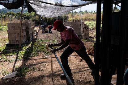 El proyecto comenzó en mayo de 2022. Los diseños de las casas son todos similares: tejas de fibrocemento y muros en bloques de concreto. Los exguerrilleros compran los materiales de las casas en la misma vereda. Maestros de obras y excombatientes trabajan a diario en la construcción. Mientras afila un palín, Fredys Tobías Pinto cuenta que está ilusionado con tener su casa propia. Pasó 35 de sus 63 años en la guerrilla. Ahora hace parte de una organización de desminado que nació con el acuerdo. “Lo más difícil del retorno a la vida civil es la estabilidad económica”, dice.