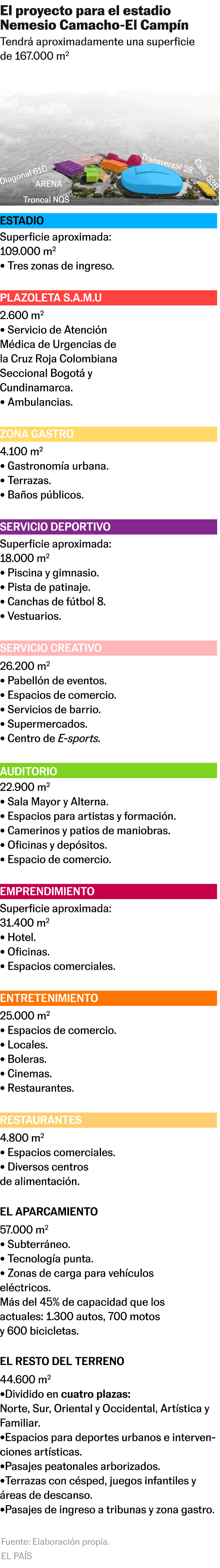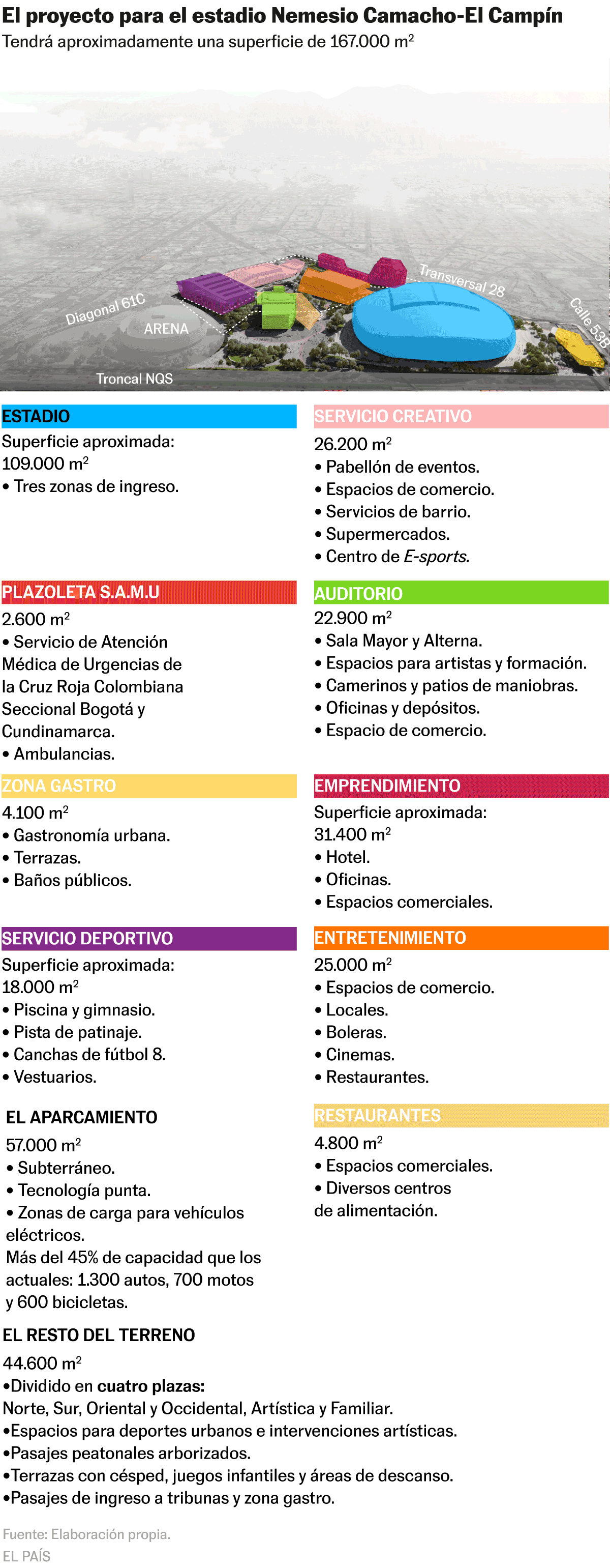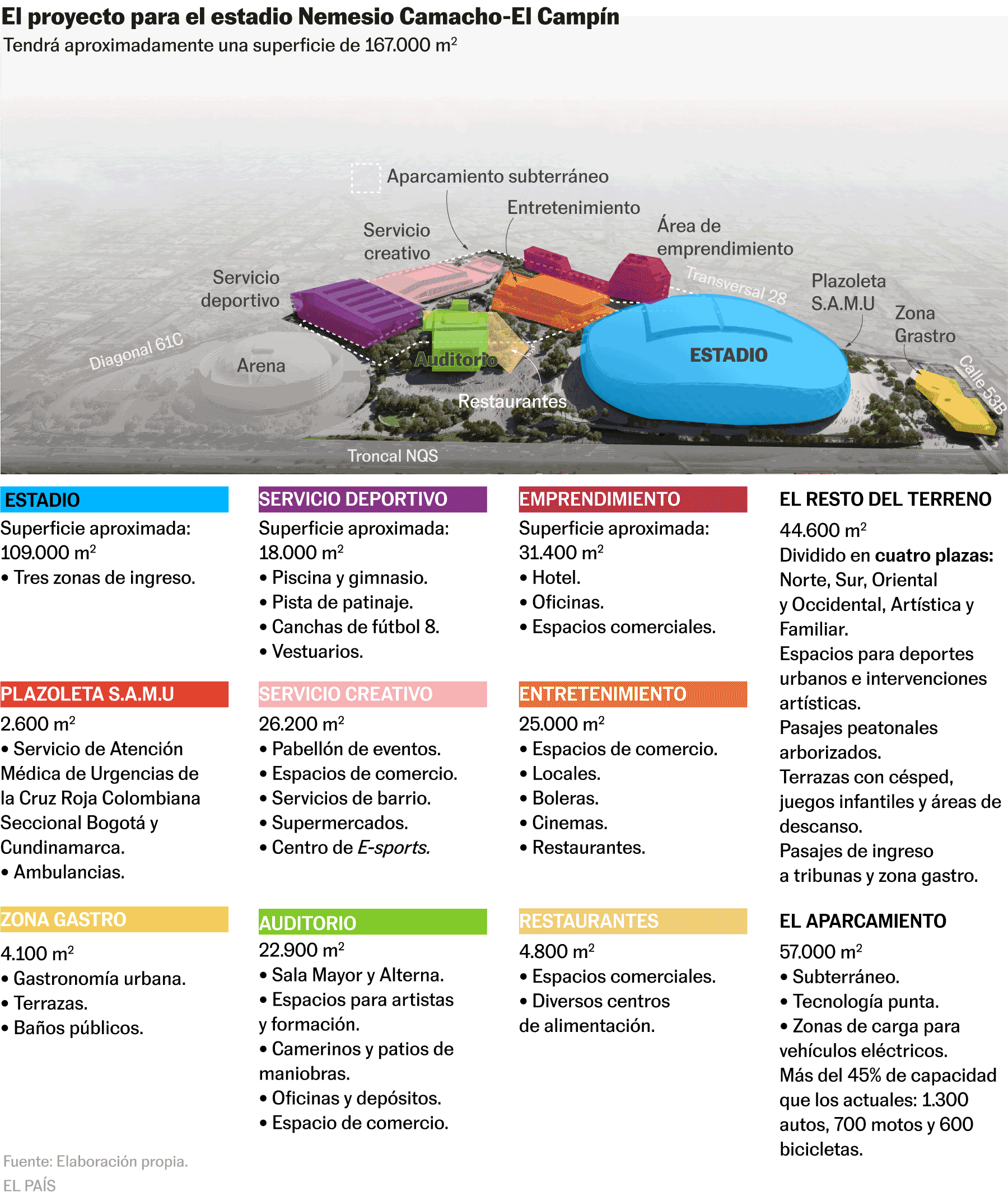 El estadio de El Campín fue construido hace 75 años en unos terrenos que donó a la ciudad una familia influyente de la época, los Camacho. De ahí que el complejo lleve como primer nombre el de uno de sus miembros, Nemesio Camacho. En este tiempo el campo ha sido remodelado hasta en cinco ocasiones, con modificaciones de calado. Pero ninguna de una forma tan radical como esta. Supone convertir un espacio poco transitable en uno de los lugares más atractivos de la ciudad. Su modelo es la transformación que ha hecho el Real Madrid con el Santiago Bernabéu y sus alrededores.