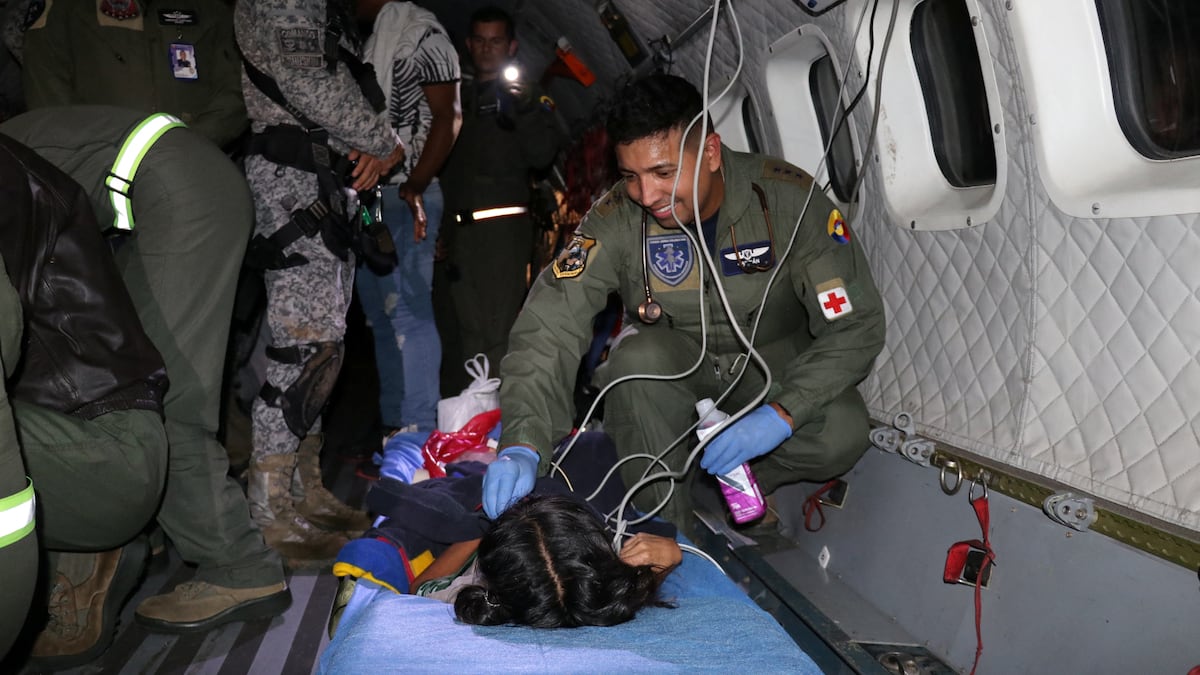 La comunidad explicó que los niños encontraron uno de los paquetes de provisiones de emergencia que lanzaron los militares. También recibieron uno de los panfletos escritos en español y en uitoto y escucharon el llamado de la abuela, que a través de unos altavoces les pedía que se quedaran quietos. No se les veían heridas, salvo por una en proceso de cicatrización en la cabeza de Lesly. Preocupaba, más bien, el tono débil de sus voces y el desgaste de las ropas, que estaban rasgadas y húmedas tras días de enfrentar las lluvias constantes de la selva.
