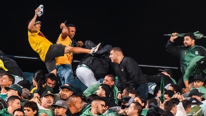 Todos coincidieron, por otro lado, en expresar el horror que producían las imágenes de violencia. El conductor del programa radial, Néstor Morales, se refirió a los hinchas implicados como “asesinos en potencia”. El secretario Villa los definió como “bandidos, criminales, delincuentes”. “Nada tiene que hacer una persona ingresando un cuchillo o un machete a un estadio”, subrayó. El alcalde, Federico Gutiérrez, escribió en X que los implicados “son delincuentes” y deben ser tratados como tal. “No son hinchas, son criminales. Ayúdanos a identificarlos”, pidió en redes junto a algunas fotos de 10 violentos. El ministro del Interior, Juan Fernando Cristo, comentó que las autoridades investigan las fallas de logística y estudian “una sanción ejemplarizante para los implicados”. En el debate público, la culpa de todo parece estar en la irracionalidad de los hinchas, algo que se comenta cíclicamente desde hace años.
