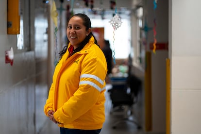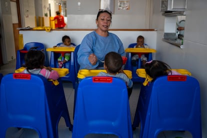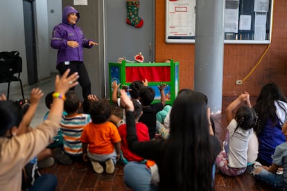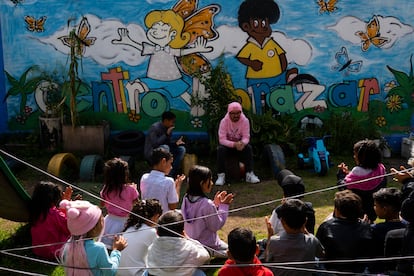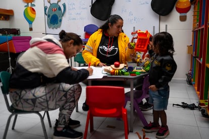 La mayoría, sin embargo, viene del país vecino. Datos del Observatorio de Migración y Movilidad Humana apuntan que, para 2024, en Bogotá habitaban alrededor de 590.737 migrantes venezolanos. Es decir, el 7,4% de la población de la ciudad. Lucibel Bastidas, nacida en Maracay, capital del Estado de Aragua, es una de ellas. Tiene 29 años, hace un año y medio que vive en la capital, y trae a sus hijos al Centro Abrazar. “Lo conocí a través de una tía mía que me dijo que los trajera, que era muy bueno, que respetaban a los niños”, comenta. “Me los cuidan bien mientras yo salgo a emplearme en un trabajo para poder ayudar a mi esposo [que es albañil] y así poder salir adelante”.
