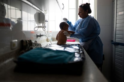 Una de las profesoras del Centro Abrazar baña a un bebé con cariño. En muchos casos, cuentan las funcionarias, las niñas y niños llegan directamente de las rutas migratorias, de caminar, sin haber tenido una ducha en meses. Si la ropa que llevan está rota, en el centro hay una dotación con donaciones para cambiarla. Pero también tienen lavadoras para limpiar las prendas que aún se pueden salvar.