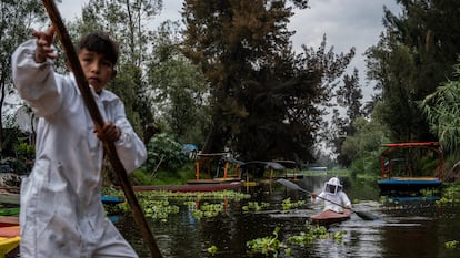 “La abeja está bailando reguetón”, dice la pequeña Guadalupe, nacida en Xochimilco, señalando a una pareja de insectos. “Están perreando”, añade David cuando mira a las mismas abejas montando una sobre otra en la colmena. La encargada de poner música al baile es esta apicultora de 34 años, que lo mismo trae a un grupo de niños a enseñarles el ciclo de la abeja, que salva panales en lugares inverosímiles de la ciudad o da servicio a las colmenas de los particulares, un original método de recuperación por el cual cualquiera puede tener su colmena a cambio de un pago mensual mucho menor que una suscripción a Netflix. A cambio de esta inversión, es posible consumir miel casera. Un sistema parecido al de las cestas de frutas y verduras cultivadas en los campos que rodean la capital y que cada semana muchas familias reciben en casa, pero en esta ocasión con polen, propóleo, jabón y miel de Xochimilco, explica Corales mientras avanza en el cayuco, moviendo el remo como un gondolero por los canales que separan su casa de las colmenas. “El cambio climático está impactando de tres formas. La primera es en lo económico; al producirse menos miel, el apicultor percibe que hay menos ingresos que el año pasado. Al ganar menos se abandonan los cultivos de las abejas y se produce un impacto social y, en tercer lugar, hay un impacto en el medio ambiente porque al no haber abejas no hay polinización y muere la flora”, resume.