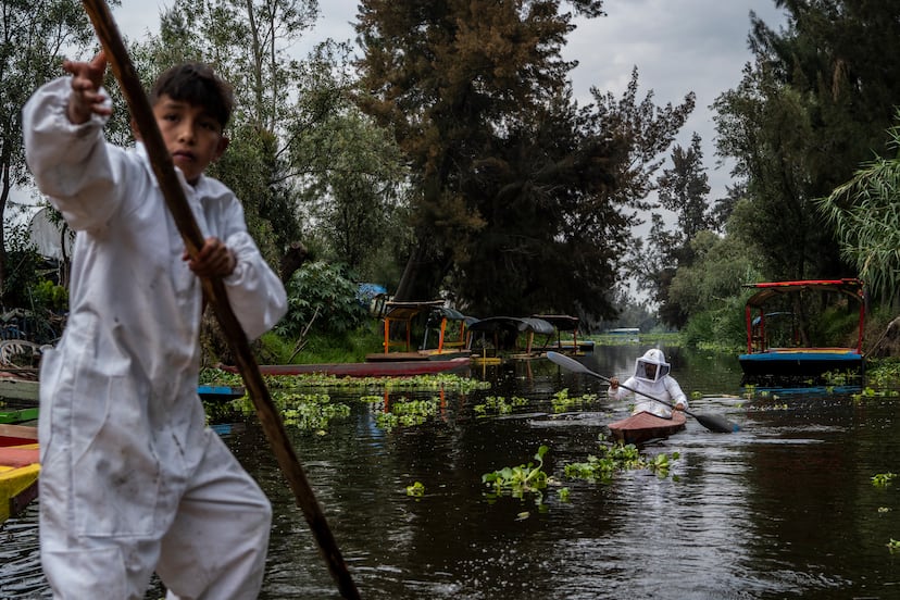 “La abeja está bailando reguetón”, dice la pequeña Guadalupe, nacida en Xochimilco, señalando a una pareja de insectos. “Están perreando”, añade David cuando mira a las mismas abejas montando una sobre otra en la colmena. La encargada de poner música al baile es esta apicultora de 34 años, que lo mismo trae a un grupo de niños a enseñarles el ciclo de la abeja, que salva panales en lugares inverosímiles de la ciudad o da servicio a las colmenas de los particulares, un original método de recuperación por el cual cualquiera puede tener su colmena a cambio de un pago mensual mucho menor que una suscripción a Netflix. A cambio de esta inversión, es posible consumir miel casera. Un sistema parecido al de las cestas de frutas y verduras cultivadas en los campos que rodean la capital y que cada semana muchas familias reciben en casa, pero en esta ocasión con polen, propóleo, jabón y miel de Xochimilco, explica Corales mientras avanza en el cayuco, moviendo el remo como un gondolero por los canales que separan su casa de las colmenas. “El cambio climático está impactando de tres formas. La primera es en lo económico; al producirse menos miel, el apicultor percibe que hay menos ingresos que el año pasado. Al ganar menos se abandonan los cultivos de las abejas y se produce un impacto social y, en tercer lugar, hay un impacto en el medio ambiente porque al no haber abejas no hay polinización y muere la flora”, resume.