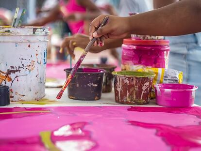 Ambas artistas, de 28 y 27 años, respectivamente, le dieron forma al Colectivo Moriviví casi sin querer. Lo que empezó siendo un grupo de mujeres jóvenes que se querían hacer un espacio entre los hombres que acaparan el arte urbano acabó siendo un proyecto de conciencia y de mezcla con las comunidades. Este año cumplen una década de un proyecto que defiende el arte público como mensaje y la creación desde dos orillas: el talento de ellas y las necesidades de las localidades con las que trabajan. “La idea de llegar para embellecer apenas es bien naive y puede hacer mucho daño”, explica por videollamada González.