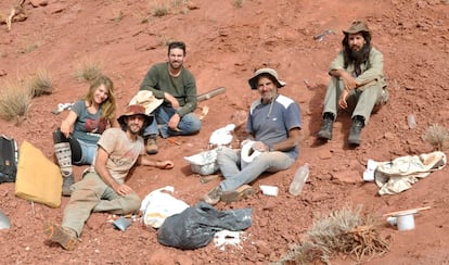 Las primeras campañas de prospección en la quebrada de Santo Domingo comenzaron en 2015. “En ese momento no sabíamos que había dinosaurios en el lugar, aunque fuimos con la idea de que podría haberlos”, explica Martín Hechenleitner, biólogo y doctor en Ciencias Naturales por la Universidad Nacional de La Plata, investigador del Conicet.