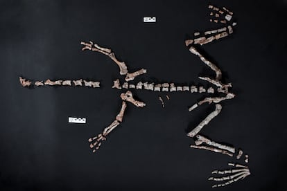 Martinelli, investigador del Conicet en el Museo Argentino de Ciencias Naturales Bernardino Rivadavia, rastreó la procedencia de esas falanges. Primero identificó un pie articulado a una pata que, luego, llevaría al equipo investigador al esqueleto casi completo. Del animal se recuperó una parte del cráneo, una serie vertebral hasta la cola, las extremidades anteriores y posteriores casi completas, y la cadera.