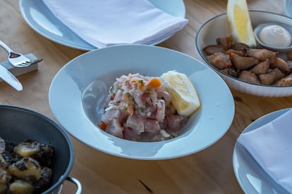 Arriba, en el segundo piso, además de la terraza, está el comedor que funciona a la carta. Circulan platos con chochas, moluscos que recuerdan a una mezcla entre ostión y almeja; pescados como el toyo, cartilaginoso y de carne firme, o un guiso de papas con luche, un alga tradicional en Chiloé. Todo sobre la mesa parece traído de un lugar remoto, cuando en realidad es lo más chileno que hay. “Hay que ir contra la corriente”, explica Layera. “Si solo ofrecemos lo que la gente demanda, muchas especies van a seguir sobreexplotadas”.