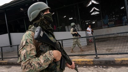 El cabo primero William, un muchacho fornido y taciturno, como los hombres de otra época, lleva un fusil Heckler & Koch al hombro. Sabe que a la mínima oportunidad “hay que dar de baja al enemigo”. Primero se dispara y después se pregunta. Es el mantra de estos días de las Fuerzas Armadas ecuatorianas. Esta mañana, en la que el sol cae a plomo, participa en un retén en la puerta de un mercado de mariscos, el Caraguay, que queda en la boca del puerto de Guayaquil y huele a salitre. Los vendedores de pescado desmontan un árbol de Navidad coronado con un cangrejo vestido de Papá Noel. William divisa a lo lejos a un taxista con tatuajes en los brazos y le da el alto. Comprueba de un vistazo que no sean de águilas ni de leones, los que usan los miembros de las pandillas más peligrosas de Ecuador, las que han desafiado al Estado con bombas y asaltos a hospitales, y lo deja ir. El taxista, antes de acelerar, le dice a través la ventanilla: