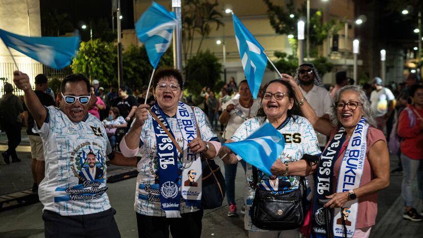 En la plaza que espera al presidente hay, sobre todo, historias de regreso. Óscar Jordan lava buques desde hace 40 años para la Armada estadounidense. Ha vuelto para ver lo que ha cambiado el país del que huyó por la pobreza. Francisco Ponce soñó cada uno de los 49 años que estuvo fuera con regresar. Trabajó como chef en Palmdale, a las afueras de Los Ángeles, porque no quiso enfrentar la violencia, primero de la guerra y después de las maras. El año pasado volvió a instalarse en la capital, donde ha empezado a administrar un apartamento. “Mi sueño americano quedó atrás, ahora estoy participando de estar acá”. La hermana de Amadeo Flores se ha montado en un vuelo de cinco horas y media solo para votar en San Salvador. Se regresa mañana a Nueva York, donde vive. Los dos llevan el rostro de Bukele estampado en una playera y salen corriendo cuando las pantallas proyectan el tuit del presidente en el que se da por ganador de las elecciones.