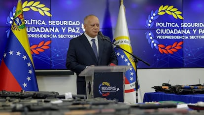 Sin mostrar pruebas, el responsable de Interior también ha acusado a la oposición de meter armas en Venezuela: “400 fusiles ingresaron desde Estados Unidos y pistolas, vinculados a la oposición. Es solo una muestra de lo recuperado, lo capturado en operaciones de inteligencia. Trataron de ingresarlo por la vía regular. El Gobierno de Venezuela garantiza la paz. No hay motivos de alarma. Estamos haciendo lo necesario para mantener la paz”, continuó en su rueda de prensa, rodeado de un arsenal de armas largas supuestamente incautadas.