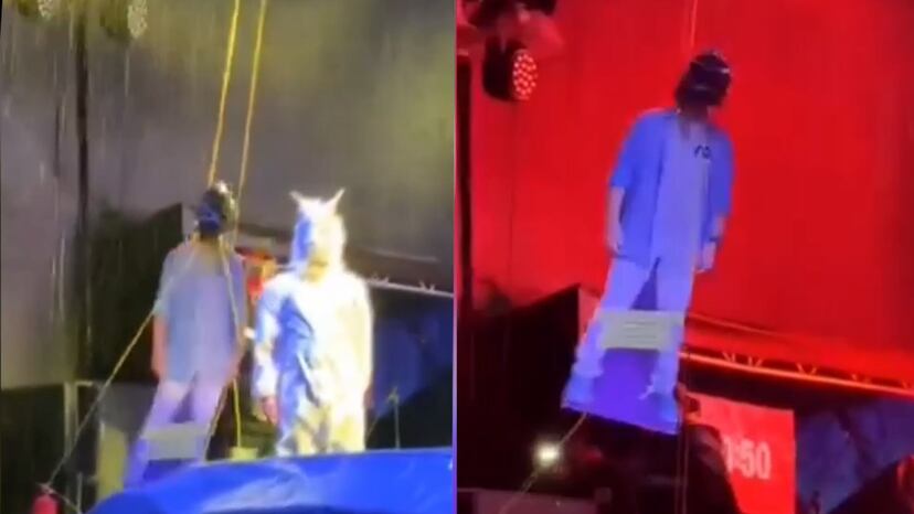 Había caído la noche en Quito. La lluvia torrencial empapaba el asfalto y el escenario en el Parque Bicentenario se teñía de un rojo intenso. El grupo de rap popular Mugre Sur llevaba ya varios minutos sobre el escenario, cambiando de disfraces estrafalarios, aquellos que han marcado la estética de sus performances. Una voz de locutor radial rompió el bullicio, anunciando el inicio de lo que vendría: un conteo regresivo… tres, dos, uno. “Llegó la hora cero. ¡Viva Ecuador!”, exclamaron los músicos. En el centro del escenario, los cantantes se mantenían inmóviles, apuntando sus micrófonos mientras entonaban sus versos. A un costado, una figura de cartón del presidente Daniel Noboa -idéntica a la que usó en su campaña electoral -empezaba a elevarse, colgada de una cuerda. La cabeza, cubierta con una bolsa negra, completaba la imagen surrealista. Los artistas cantaban una canción con letra de protesta contra el poder, entonada con el coro que hacía el público.