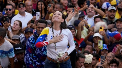 Cuando María Corina Machado apareció en medio de la calle Élice del municipio caraqueño de Chacao, precedida de una caravana de motos confundida al principio con colectivos chavistas amedrentando a la población, los manifestantes corrieron hacia ella y llamaron a los demás para que se acercaran. Parada sobre un camión, habló la dirigente que se dejaba ver después de estar casi cuatro meses escondida. Desde los edificios se asomaron para confirmar. En medio de la multitud, una mujer grabó los primeros minutos de su mensaje y lo envío por WhatsApp a los grupos de la familia repartidos por el mundo. “Esta mujer tiene más guáramo [valor] que cualquier hombre. Es mi inspiración”, le escribió a los suyos que enviaban sus postales desde otras ciudades extranjeras, donde también ocurrieron manifestaciones en rechazo a la toma de posesión de Nicolás Maduro prevista para este viernes.