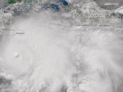 Las nubes ya cubren la isla de Jamaica entera y los vientos arrecian, pero la tormenta, oficialmente, no ha llegado. El huracán Melissa, de categoría 5 en la escala Saffir-Simpson, la máxima posible, se ha ido fortaleciendo a lo largo del fin de semana mientras se mueve lentamente hacia el noreste por encima de las aguas cálidas del Mar Caribe, y se espera que todavía gane más fuerza en las próximas 24 horas. Con vientos sostenidos de 280 kilómetros por hora, el ciclón es ya el más potente del mundo este año, y está entre los 10 más fuertes de los que se tienen registro históricamente. Se espera que toque tierra entre la noche del lunes y la madrugada de este martes, con el ojo proyectado a pasar a unos 100 kilómetros al oeste de la capital Kingston. El Centro Nacional de Huracanes de Estados Unidos (NHC, por sus siglas en inglés) ha advertido de que “el potencial de lluvia es extremo” y que “dada la lentitud de la tormenta, va a crear un evento catastrófico en Jamaica”.