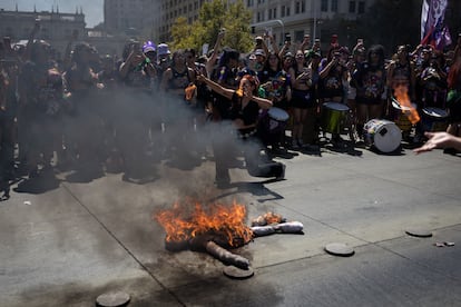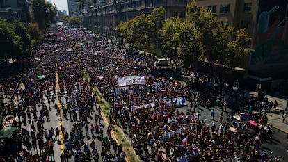 Chilenas de todas las edades —40.000 según las estimaciones de Carabineros— salieron a las calles de la capital. La convocatoria fue a las 10 de la mañana este domingo, en la Plaza Italia, un centro neurálgico de Santiago de Chile, y la marcha arrancó a las 11 horas. Diversas agrupaciones de mujeres de diferentes partes del país, clubes deportivos, partidos políticos, pero sobre todo ciudadanas de diferentes generaciones hicieron de este 8M una jornada festiva —cantada, bailada y colorida—, organizada por la Coordinadora Feminista 8M. La cantidad de gente, sin embargo, fue significativamente inferior a la que salió a las calles en 2020, en medio del estallido social, cuando según Carabineros salieron 150.000 mujeres a los espacios públicos. De acuerdo a expertos y organizadoras, sin embargo, en aquella ocasión fueron muchas más.