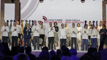 Los retos climáticos son precisamente uno de los ejes de la cita, cuyo lema es “Juntos por una Iberoamérica justa y sostenible”. La reunión de presidentes y jefes de Estado tiene previsto aprobar tres documentos, una Carta Medioambiental o Pacto Verde Iberoamericano, una Carta de Principios Derechos Digitales y una Estrategia de Seguridad Alimentaria. Se cayó a última hora una propuesta central sobre arquitectura financiera internacional, que perseguía en última instancia una reforma del mercado para facilitar el acceso a los créditos. La falta de consenso por la oposición de algunos países, por ejemplo Cuba, frenó ese debate, según fuentes diplomáticas. Su mandatario, Miguel Díaz-Canel, fue uno de los 11 que esta noche compartieron escenario con el anfitrión, el dominicano Luis Abinader, el rey Felipe VI, el chileno Gabriel Boric, el argentino Alberto Fernández, el boliviano Luis Arce o la hondureña Xiomara Castro.