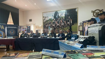 Durante el allanamiento en el municipio de San Isidro, en el norte rico de la periferia de Buenos Aires, las autoridades incautaron 222 libros distintos, 140 tapas de ejemplares que el hombre no llegó a imprimir, y un par de impresoras de oficina. El hallazgo de los detectives federales se expuso este miércoles en un salón de la sede del Cuerpo de la Policía Montada, en la capital argentina. Encontraron varias ediciones distintas de Mi Lucha y de ¡Las SS te llaman!, un panfleto del ejército de Hitler publicado en plena Segunda Guerra Mundial. Pero también títulos variadísimos bajo el nombre de una veintena de editoriales, que iban desde la negación del genocidio nazi o las responsabilidades de la Alemania nazi y del régimen de Francisco Franco en España en el bombardeo de Guernika, a biografías apócrifas del magnate automovilístico norteamericano Henry Ford y panfletos en contra del judaísmo en Argentina. Muchos de los libros mostraban símbolos como esvásticas, la Reichsadler –el águila imperial del nacionalsocialismo alemán–, o las cruces de hierro que utilizaron los nazis para condecorar a sus oficiales.