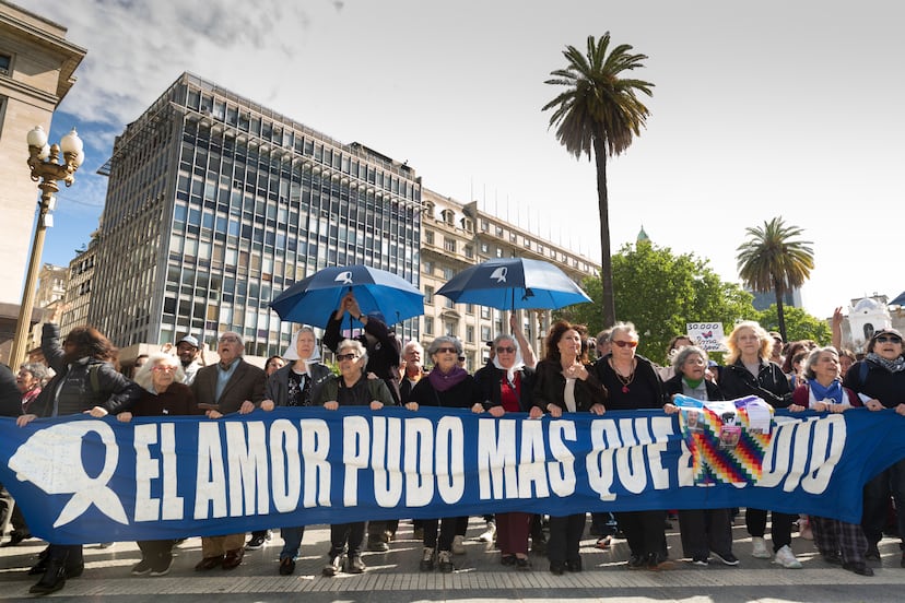 Arias arengó a la movilización a través de la lectura de un discurso de Hebe de Bonafini, la histórica presidenta de esta organización de derechos humanos fallecida el año pasado. “No nos podemos quedar callados ni quietos ni amargados ni llorando ni pegándonos en la espalda con un palo. La resistencia y el combate son derechos de los pueblos que nosotros no vamos a abandonar, porque esta plaza es esto”, dijo Hebe de Bonafini en 2017. Sus palabras, lanzadas inicialmente contra el Gobierno del conservador Mauricio Macri, fueron recibidas con aplausos y algunas lágrimas seis años después.