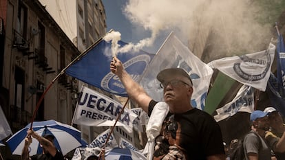“La patria no se vende” es la consigna que más se cantó esta mañana frente al Congreso, donde la Confederación General del Trabajo (CGT), la central sindical más grande de Argentina, había convocado una marcha que acompañe la huelga general de este miércoles. Miles de personas se congregaron sobre la avenida de Mayo, una arteria del centro de Buenos Aires que conecta el Congreso con la Casa Rosada, sede del Ejecutivo. Hasta allí llegaron camioneros, trabajadores de la salud o empleados de las oficinas del Estado, pero también cientos de jubilados, inquilinos, asociaciones de teatro, editores de libros, activistas ambientales o defensores de los derechos de las personas con discapacidad. También lo hicieron el peronismo de Unión por la Patria y el Frente de Izquierda y de los Trabajadores. Cada uno de ellos con un argumento en contra de una megaley que no deja sector de la economía nacional sin tocar en sus más de 500 artículos.