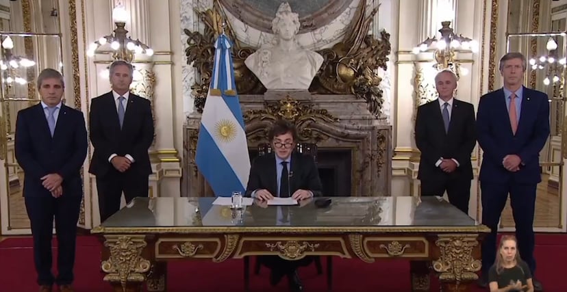 Milei había grabado el mensaje en la tarde de este lunes ante una gran expectación: el viernes, en un foro empresarial, había adelantado que tenía anuncios económicos, y eligió darlos en la víspera de la convocatoria de protestas masivas que se esperan en las calles de las principales ciudades del país este martes por los recortes en la educación pública. No tenía anuncios, pero el presidente ha aprovechado la oportunidad para defender su ajuste fiscal acompañado de su ministro de Economía, Luis Caputo, y las autoridades del Banco Central. “El déficit cero no es solo una consigna de marketing para este Gobierno, sino que es un mandamiento”, dijo el presidente en tono electoral. “La era del supuesto Estado presente ha terminado. Ha sido un fracaso estrepitoso que ha sumergido al 60% de la población en la pobreza”.
