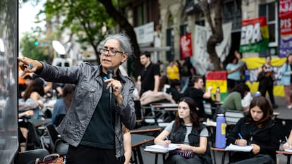 Son dos profesores y dictan una clase de historia argentina a una veintena de alumnos. Ambos tienen carteles colgando del cuello: “docente bajo la línea de pobreza”, dice el de él; “docente hija de trabajadores”, dice el de ella. Los estudiantes se esfuerzan por escucharlos y seguir el hilo de sus explicaciones al sol del mediodía, mientras a unos pocos metros pasan autos y ómnibus, más cerca otros profesores enseñan otras materias. Son todas clases públicas, dictadas a la intemperie, sobre la calle que permanece cortada al tránsito, los pupitres desperdigados sobre el asfalto frente a la Facultad de Ciencias Sociales de la Universidad de Buenos Aires (UBA). Escenas parecidas se reprodujeron este lunes y este martes en decenas de sedes universitarias de la Argentina, donde estudiantes y docentes protagonizan protestas para exigirle al Gobierno de Javier Milei mayores recursos para la educación superior pública y mejores salarios para profesores y empleados. “No voy a ceder”, dijo el presidente ultraderechista y reiteró sus ataques contra los supuestos “delincuentes” de las casas de estudios. Su ministra de Seguridad fue más allá este miércoles: acusó a los universitarios de “generar una revuelta y tratar de desestabilizar” al Gobierno. Incluso pronosticó que “van a ir con molotovs”.